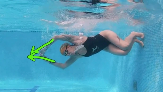 Igual que en braza, se toca la pared con las dos manos, se gira el cuerpo hacia un lado, se estira en flecha, se apoya en la pared y se impulsa para seguir nadando.